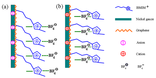 A schematic showing the collocation of anions and cations at the GNS electrode/ionic liquid interface during the charging (a) and the discharging (b) processes. (Image by YAN Xingbin et al.)