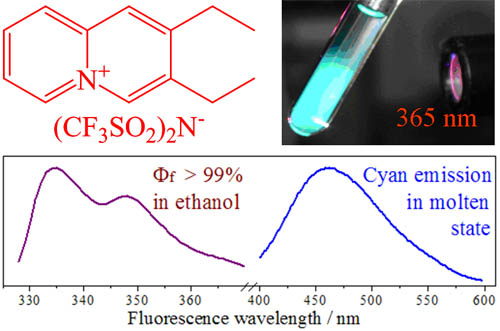 研究人员设计并合成了一类新型的基于无支链阳离子中心的喹啉鎓离子液体。不同于传统的离子液体,这类离子液体具有特殊的热分解行为,能稳定某些强亲核性的阴离子。这类化合物还具有特殊的荧光性质,如在乙醇溶液中,能发出极强的荧光(紫外区),其量子产量高达99%,而在熔融的凝聚态,又可发出强的青蓝色荧光(可见区)。该研究成果发表在J. Mater. Chem. (2011, 21, 8979-8982) 上。