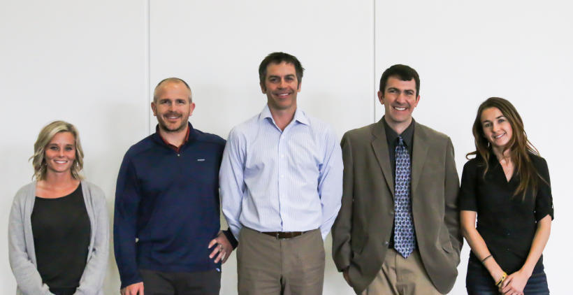 Team members who discovered a treatment for resistant infections are, from left, Aimee Newsham, Dixie State University student; Rico Del Sesto, Dixie State University professor; David Fox, Los Alamos National Laboratory; Andrew Koppisch, Northern Arizona University professor; and Mattie Jones, Dixie State University student. (Courtesy of David Fox)